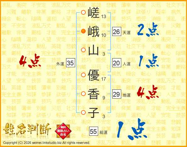 嵯(13画)峨(10画)山(3画) 優(17画)香(9画)子(3画)