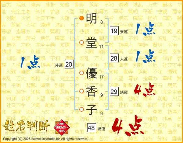 明(8画)堂(11画) 優(17画)香(9画)子(3画)