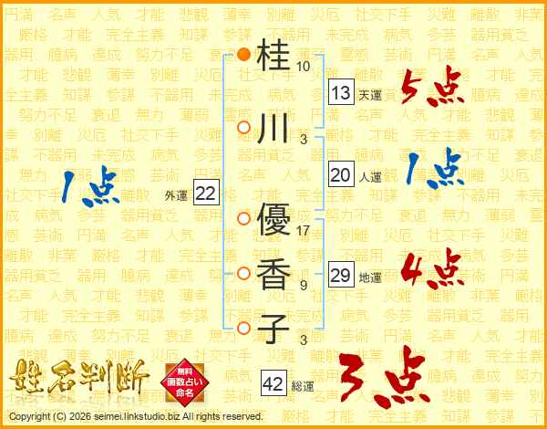 桂(10画)川(3画) 優(17画)香(9画)子(3画)