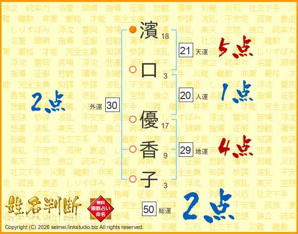 濱(18画)口(3画) 優(17画)香(9画)子(3画)