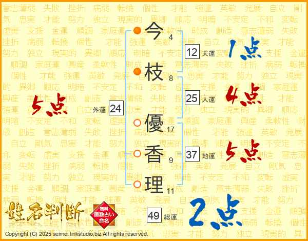 今(4画)枝(8画) 優(17画)香(9画)理(11画)