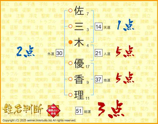 佐(7画)三(3画)木(4画) 優(17画)香(9画)理(11画)