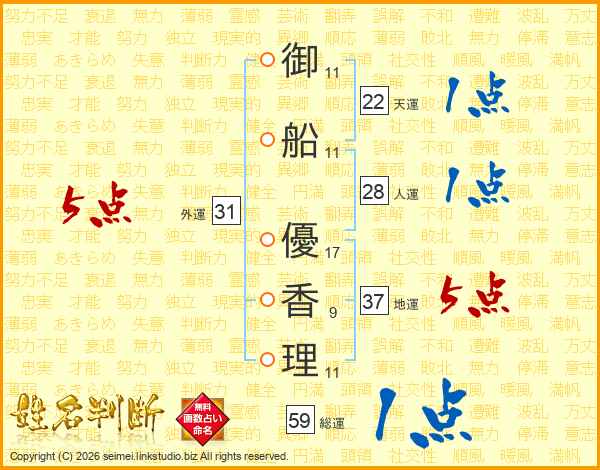 御(11画)船(11画) 優(17画)香(9画)理(11画)