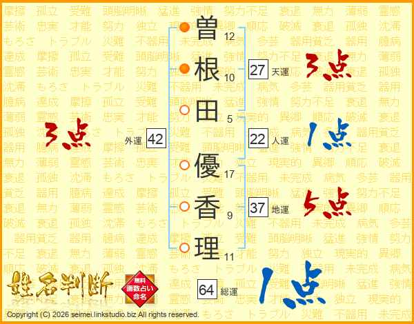 曽(12画)根(10画)田(5画) 優(17画)香(9画)理(11画)