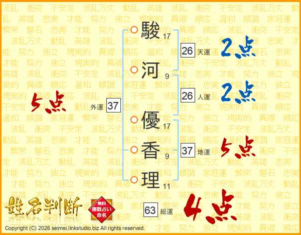 駿(17画)河(9画) 優(17画)香(9画)理(11画)