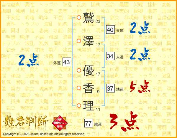 鷲澤優香理さんの外運は43画の2点!