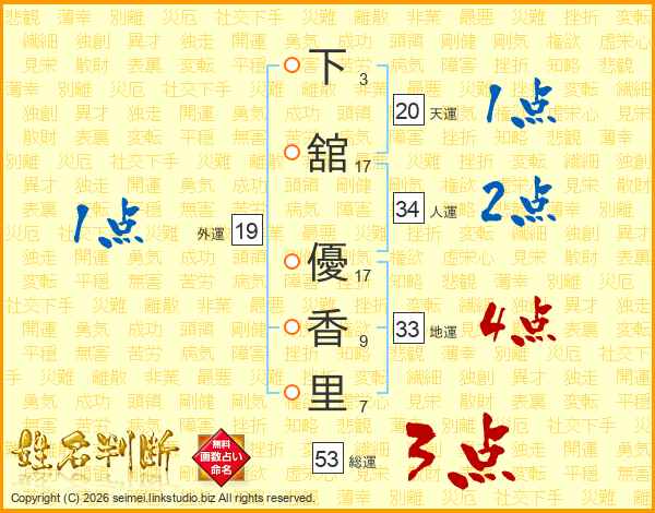 下(3画)舘(17画) 優(17画)香(9画)里(7画)