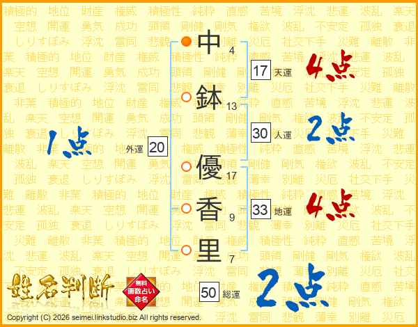 中(4画)鉢(13画) 優(17画)香(9画)里(7画)