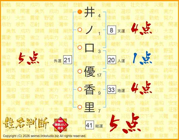 井(4画)ノ(1画)口(3画) 優(17画)香(9画)里(7画)
