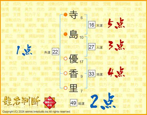 寺(6画)島(10画) 優(17画)香(9画)里(7画)
