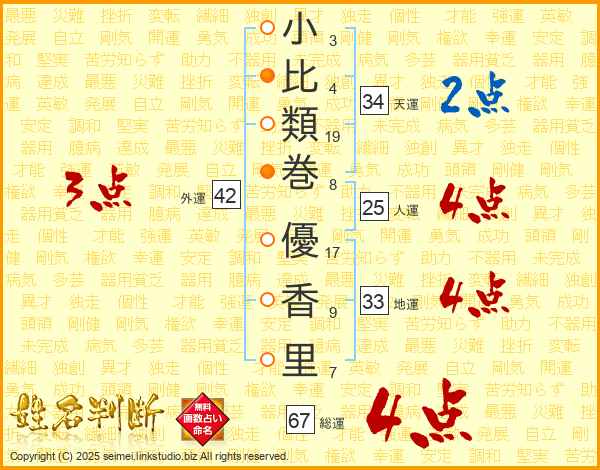 小(3画)比(4画)類(19画)巻(8画) 優(17画)香(9画)里(7画)