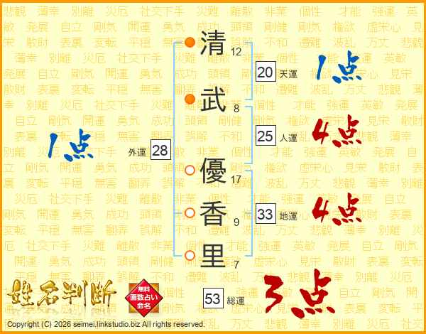 清(12画)武(8画) 優(17画)香(9画)里(7画)