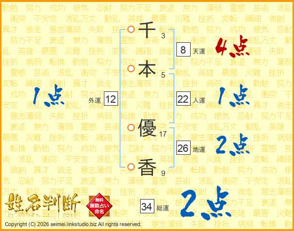 千(3画)本(5画) 優(17画)香(9画)