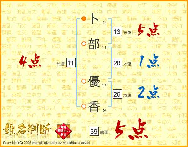 卜部優香さんの総運は39画の5点!