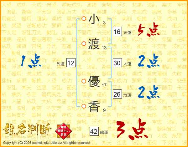 小(3画)渡(13画) 優(17画)香(9画)