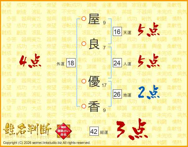 屋(9画)良(7画) 優(17画)香(9画)