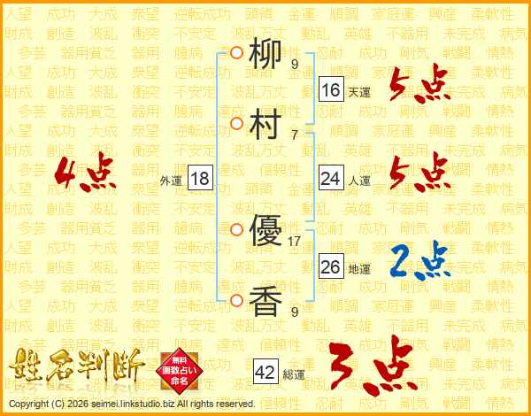 生活面を象徴する運勢です。外部から受ける影響力を表し、結婚運、家庭運や職場、環境への順応性を表します。総運から人運を引いた画数。姓や名が1文字の場合を除く。