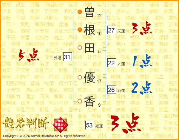 曽(12画)根(10画)田(5画) 優(17画)香(9画)