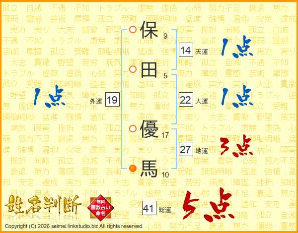 保田優馬さんの総運は41画の5点!
