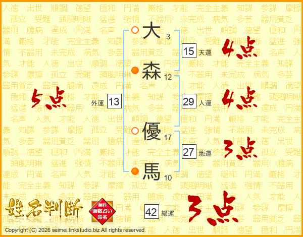 大(3画)森(12画) 優(17画)馬(10画)