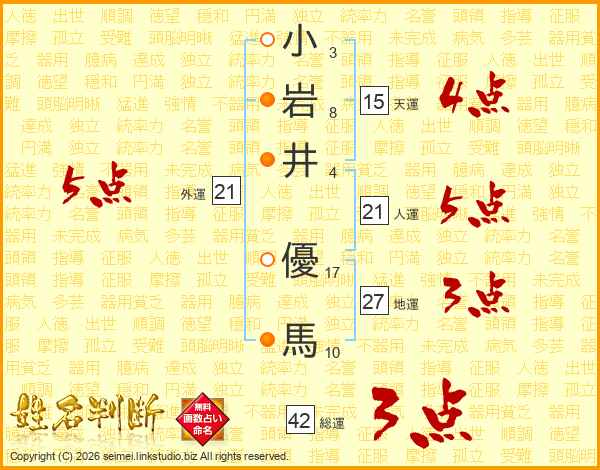 小(3画)岩(8画)井(4画) 優(17画)馬(10画)