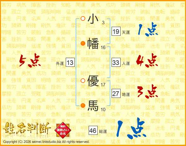 生活面を象徴する運勢です。外部から受ける影響力を表し、結婚運、家庭運や職場、環境への順応性を表します。総運から人運を引いた画数。姓や名が1文字の場合を除く。