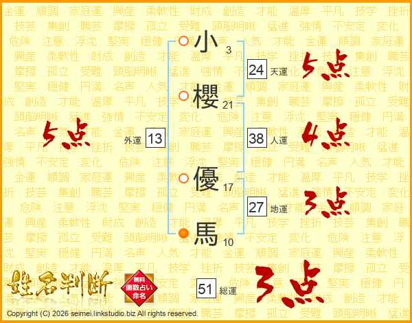 小(3画)櫻(21画) 優(17画)馬(10画)