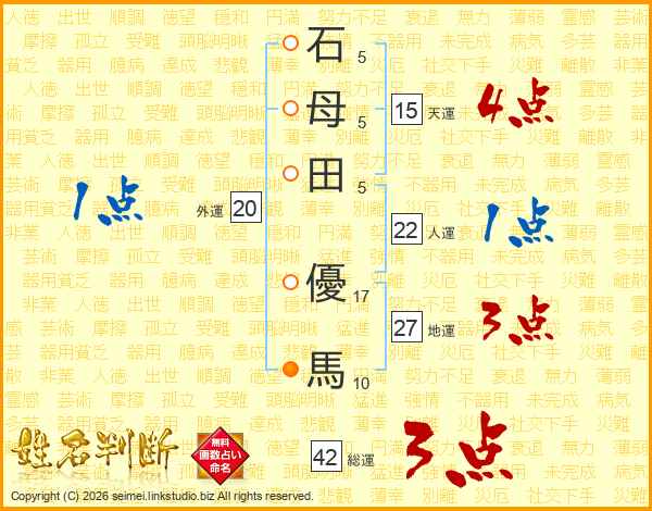 石(5画)母(5画)田(5画) 優(17画)馬(10画)