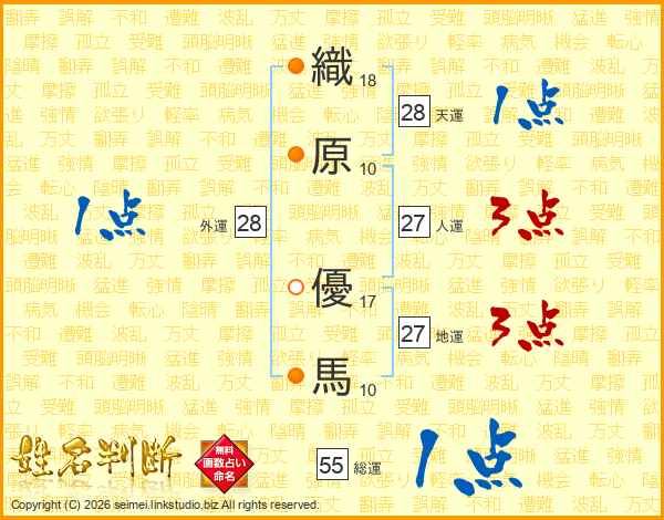 織(18画)原(10画) 優(17画)馬(10画)