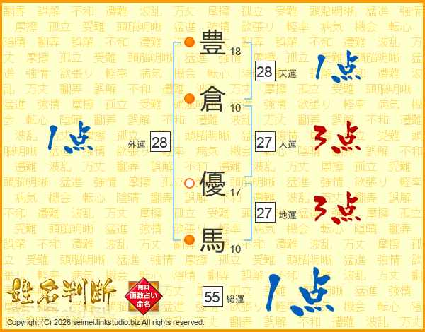 豊(18画)倉(10画) 優(17画)馬(10画)