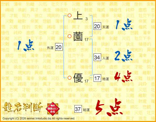 生活面を象徴する運勢です。外部から受ける影響力を表し、結婚運、家庭運や職場、環境への順応性を表します。総運から人運を引いた画数。姓や名が1文字の場合を除く。