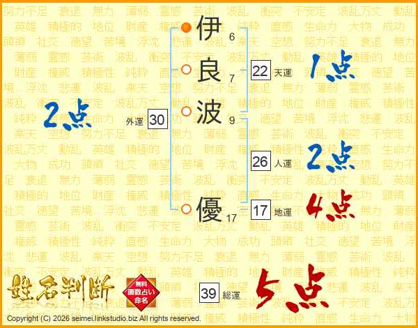 伊(6画)良(7画)波(9画) 優(17画)