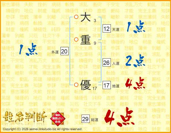 画数の奇数(○陽)と偶数(●陰)の配列で吉凶を占います。どちらかにかたよる名前は大凶名で避ける必要があります。画数の奇数偶数。