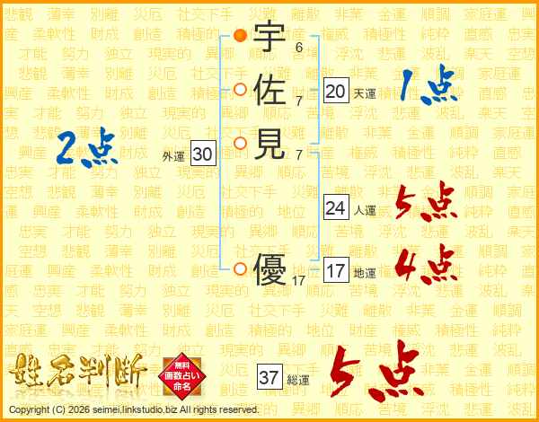 宇(6画)佐(7画)見(7画) 優(17画)