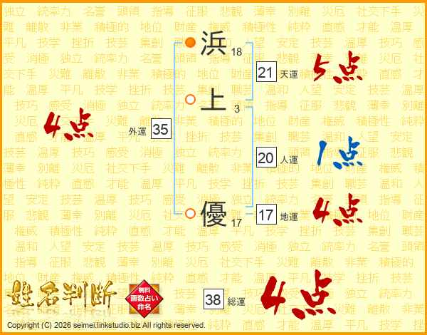 浜上優さんの総運は38画の4点!