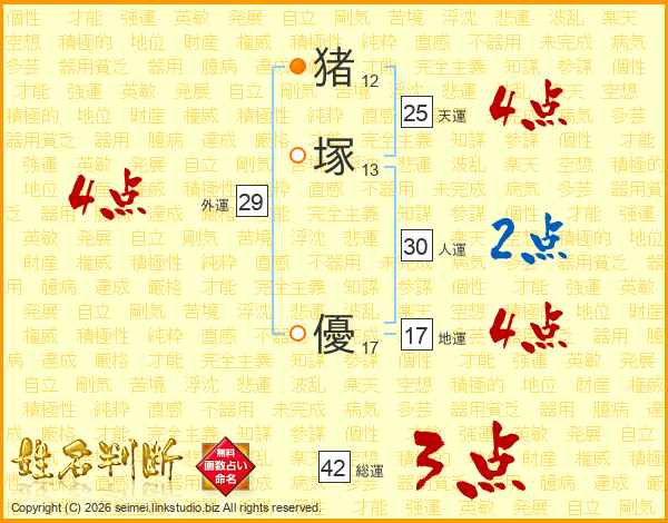 猪(12画)塚(13画) 優(17画)