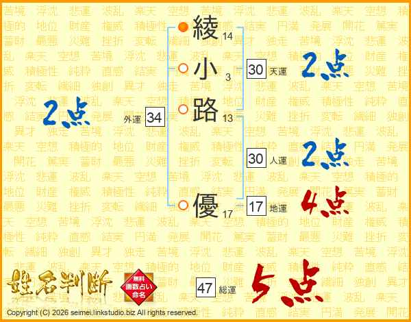 生活面を象徴する運勢です。外部から受ける影響力を表し、結婚運、家庭運や職場、環境への順応性を表します。総運から人運を引いた画数。姓や名が1文字の場合を除く。