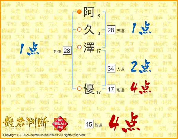 画数の奇数(○陽)と偶数(●陰)の配列で吉凶を占います。どちらかにかたよる名前は大凶名で避ける必要があります。画数の奇数偶数。