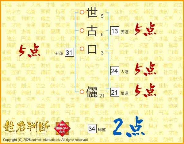 生活面を象徴する運勢です。外部から受ける影響力を表し、結婚運、家庭運や職場、環境への順応性を表します。総運から人運を引いた画数。姓や名が1文字の場合を除く。