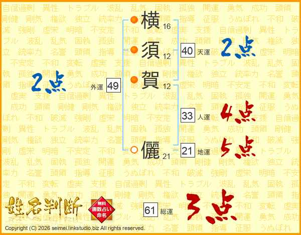 生活面を象徴する運勢です。外部から受ける影響力を表し、結婚運、家庭運や職場、環境への順応性を表します。総運から人運を引いた画数。姓や名が1文字の場合を除く。