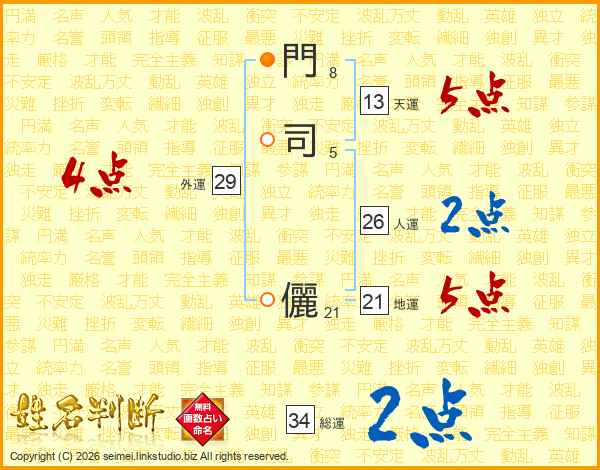 門(8画)司(5画) 儷(21画)