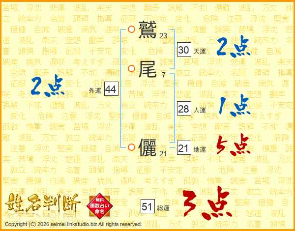 生活面を象徴する運勢です。外部から受ける影響力を表し、結婚運、家庭運や職場、環境への順応性を表します。総運から人運を引いた画数。姓や名が1文字の場合を除く。