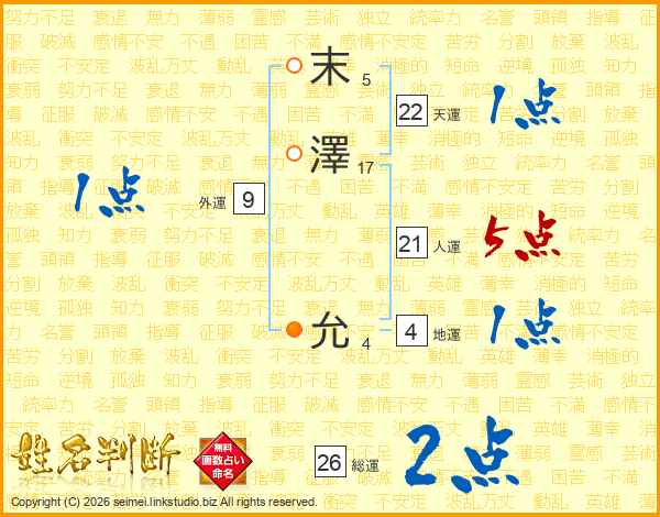 生活面を象徴する運勢です。外部から受ける影響力を表し、結婚運、家庭運や職場、環境への順応性を表します。総運から人運を引いた画数。姓や名が1文字の場合を除く。