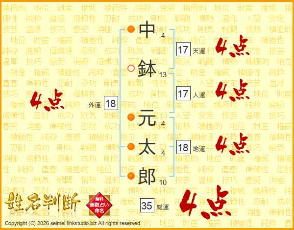 中(4画)鉢(13画) 元(4画)太(4画)郎(10画)