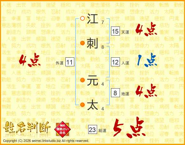 生活面を象徴する運勢です。外部から受ける影響力を表し、結婚運、家庭運や職場、環境への順応性を表します。総運から人運を引いた画数。姓や名が1文字の場合を除く。
