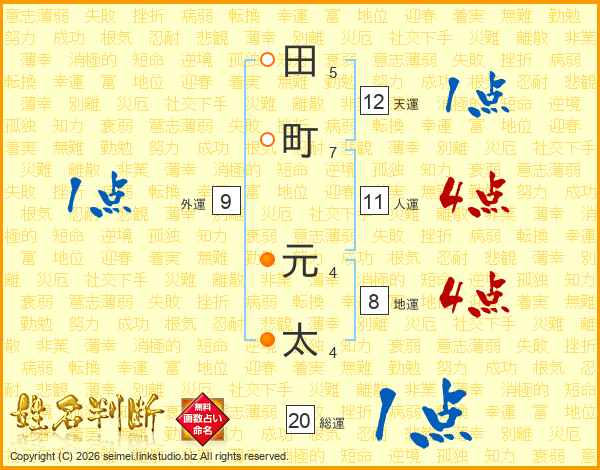 あなたの人生を表す1番重要な運勢です。生涯を通じて影響する総合運となり、主に50歳以降の晩年期に影響を及ぼします。苗字と名前の合計画数。