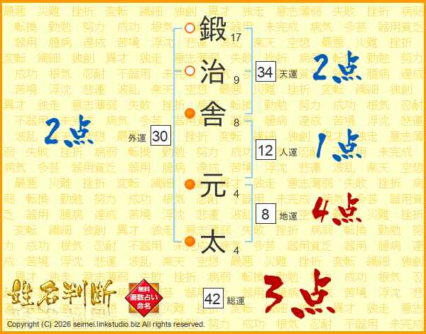 鍛(17画)治(9画)舎(8画) 元(4画)太(4画)