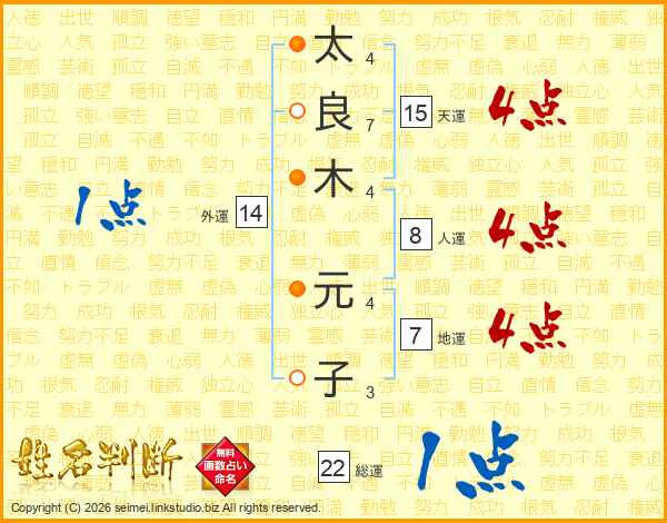 太(4画)良(7画)木(4画) 元(4画)子(3画)