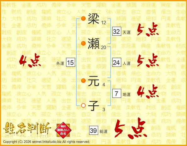 梁(12画)瀬(20画) 元(4画)子(3画)
