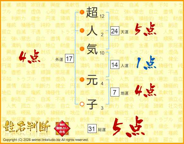 超人気元子さんの総運は31画の5点!